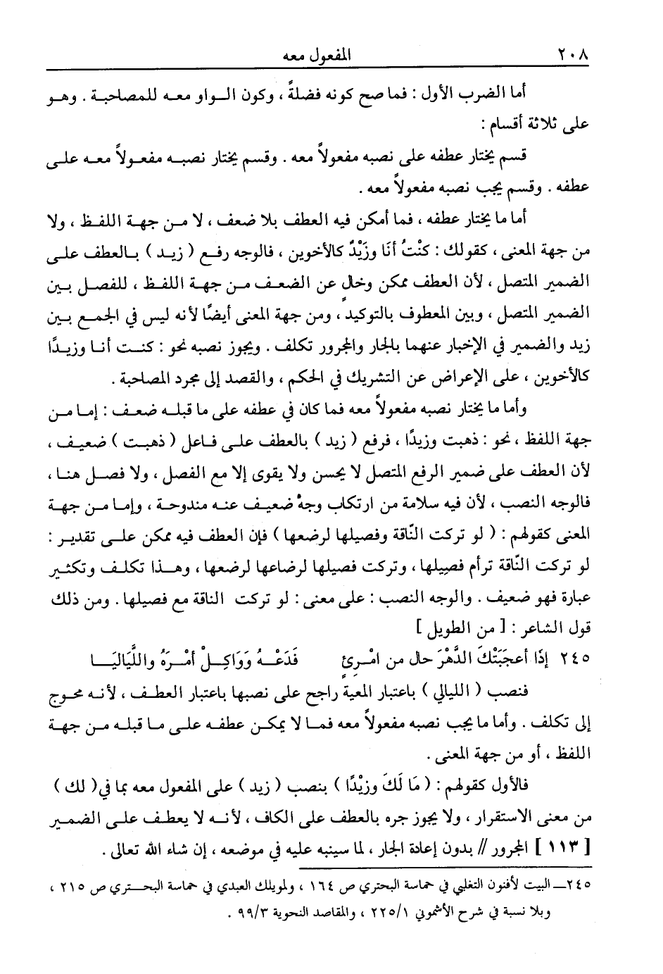 قسم يختار عطفه على نصبه مفعولا معه. وقسم يختار نصبه مفعولا معه على عطفه. وقسم يجب نصبه مفعولا معه.