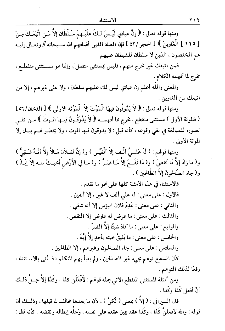 ومنها قولهم: (له على ألف إلا ألفين) و (إن لفلان مالا إلا أنه شقي) و (ما زاد إلا ما نقص) و (ما نفع إلا ما ضر) و (ما في الأرض أخبث منه إلا إياه) و (جاء الصالحون إلا الطالحين).