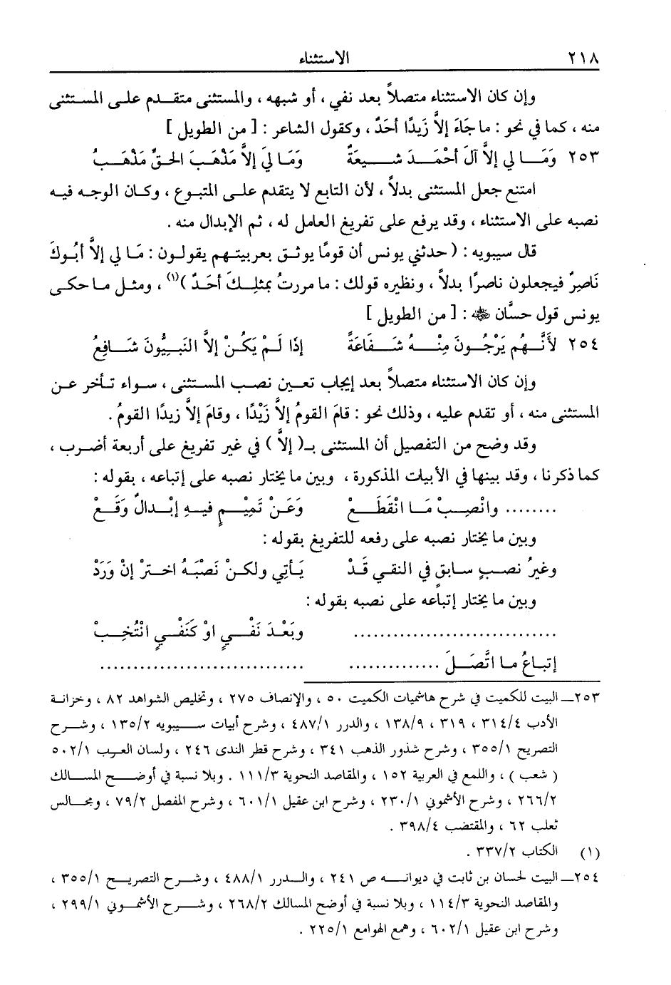 وقد وضح من التفصيل أن المستثنى بـ (إلا) في غير تفريغ على أربعة أضرب، كما ذكرنا، وقد بينها في الأبيات المذكورة، وبين ما يختار نصبه على إتباعه، بقوله: