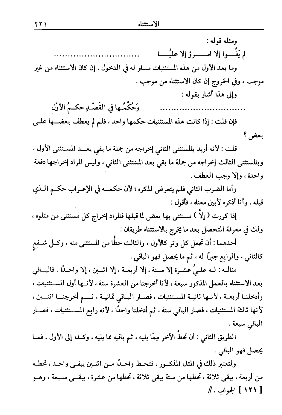 مثاله: له علي عشرة إلا ستة، إلا أربعة، إلا اثنين، إلا واحدًا. فالباقي بعد الاستثناء بالعمل المذكور سبعة، لأنا أخرجنا من العشرة ستة، لأنها أول المستثنيات، وأدخلنا أربعة، لأنها ثانية المستثنيات، فصار الباقي ثماينة، ثم أخرجنا اثنين، لأنها ثالثة المستثنيات، فصار الباقي ستة، ثم أدخلنا واحدًا، لأنه رابع المستثنيات، فصار الباقي سبعة.