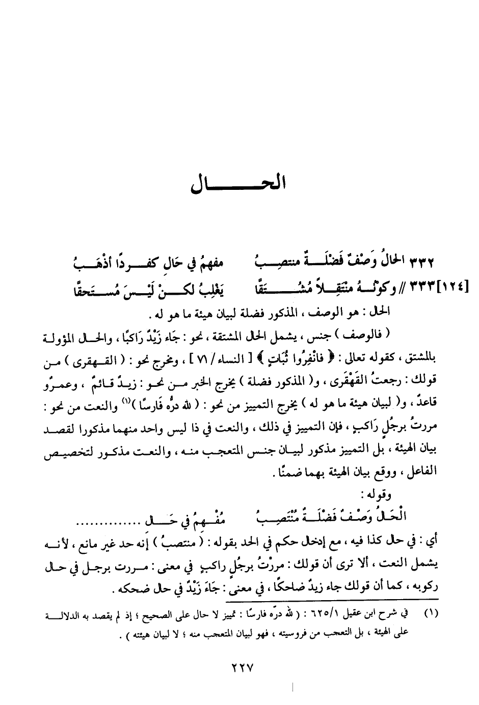 332 - الحال وصف فضلةً منتصب ... مفهم في حال كفردًا أذهب [124] //