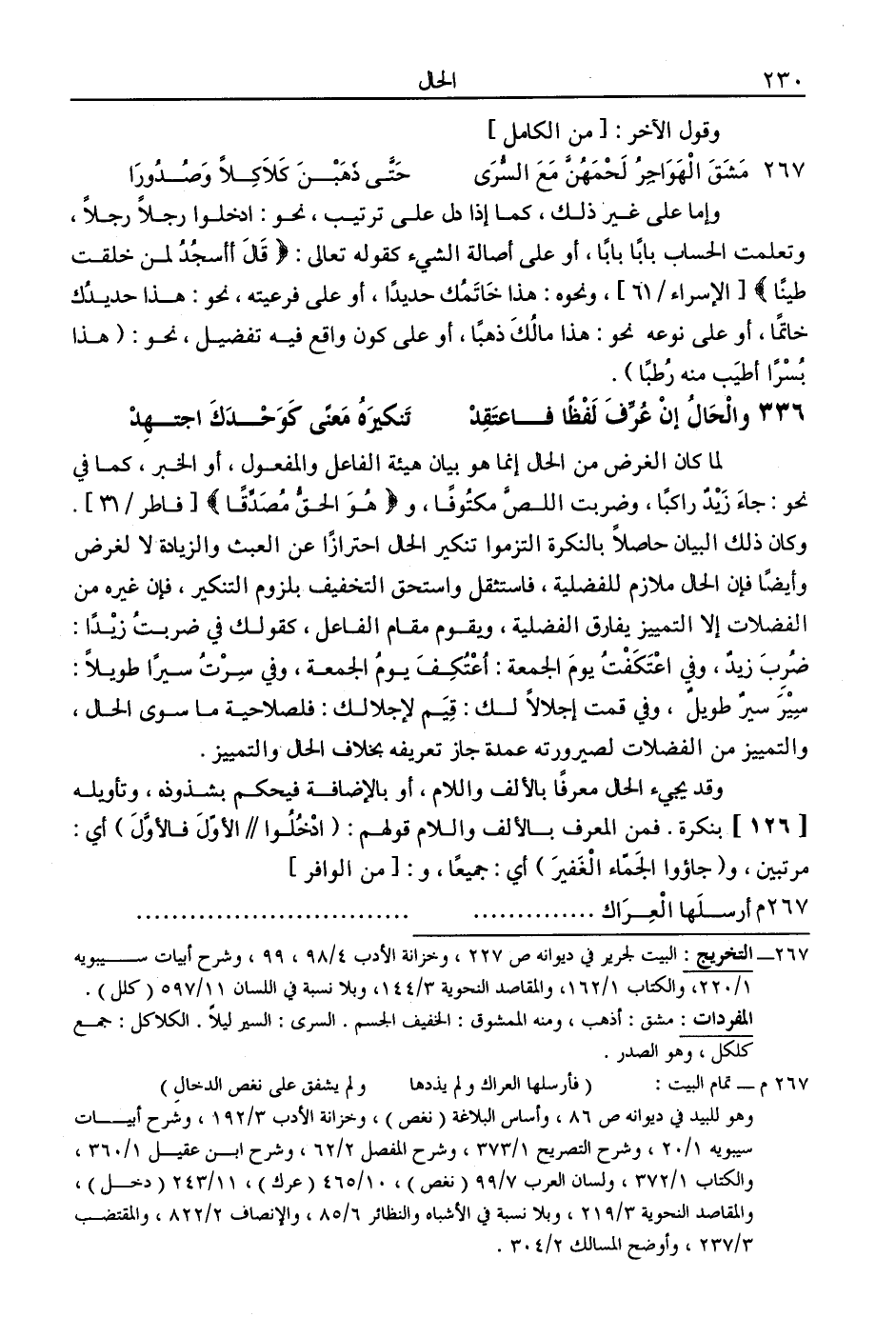 وقد يجيء الحال معرفًا بالألف واللام، أو بالإضافة فيحكم بشذوذه، وتأويله [126] بنكرة. فمن المعرف بالألف واللام قولهم: (ادخلوا // الأول فالأول) أي: مرتبين، و (جاؤوا الجماء الغفير) أي: جميعًا، و: [من الوافر]