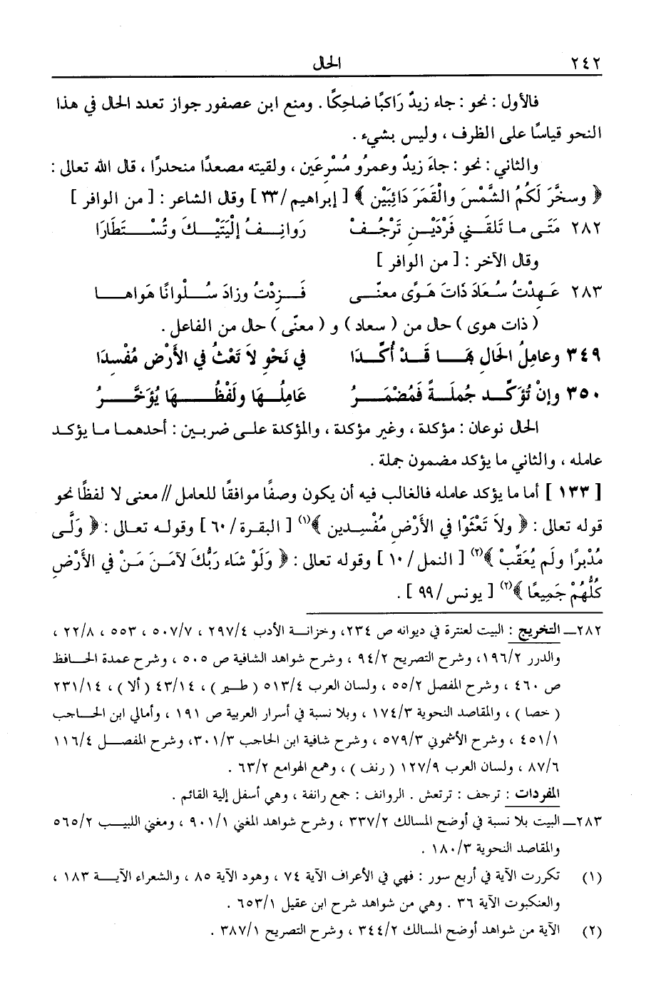 [133] أما ما يؤكد عامله فالغالب فيه أن يكون وصفًا موافقًا للعامل // معنى لا لفظًا نحو قوله تعالى: (ولا تعثوا في الأرض مفسدين) [البقرة /60] وقوله تعالى: (ولى مدبرًا ولم يعقب) [النمل /10] وقوله تعالى: (ولو شاء ربك لآمن من في الأرض كلهم جميعًا) [يونس /99].