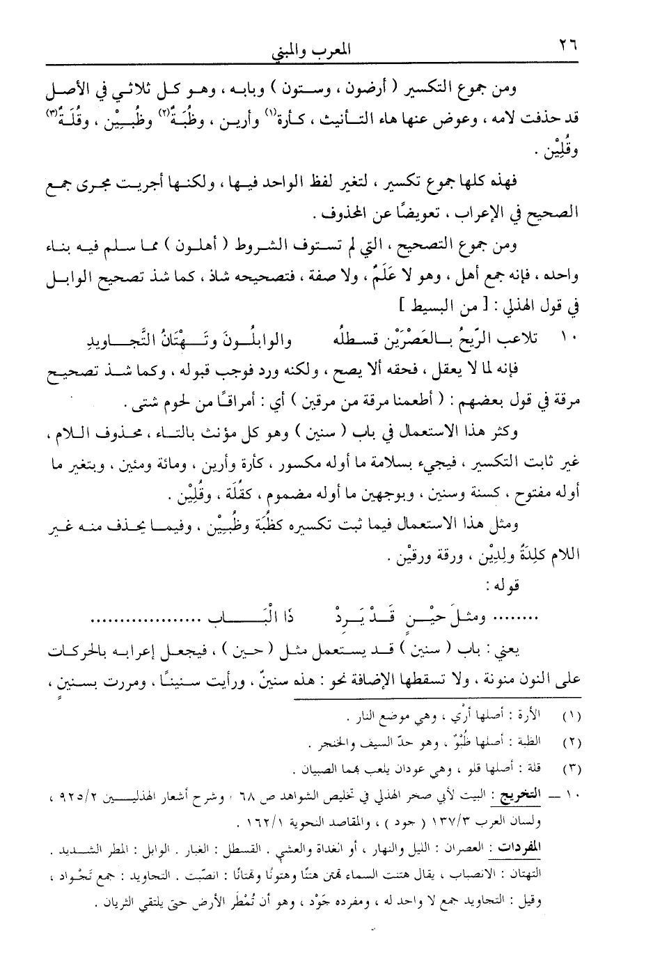 ومن جموع التكسير (أرضون، وستون) وبابه، وهو كل ثلاثي في الأصل قد حذفت لامه، وعوض عنها هاء التأنيث، كأرة وأرين، وظبةً وظبين، وقلة وقلين.