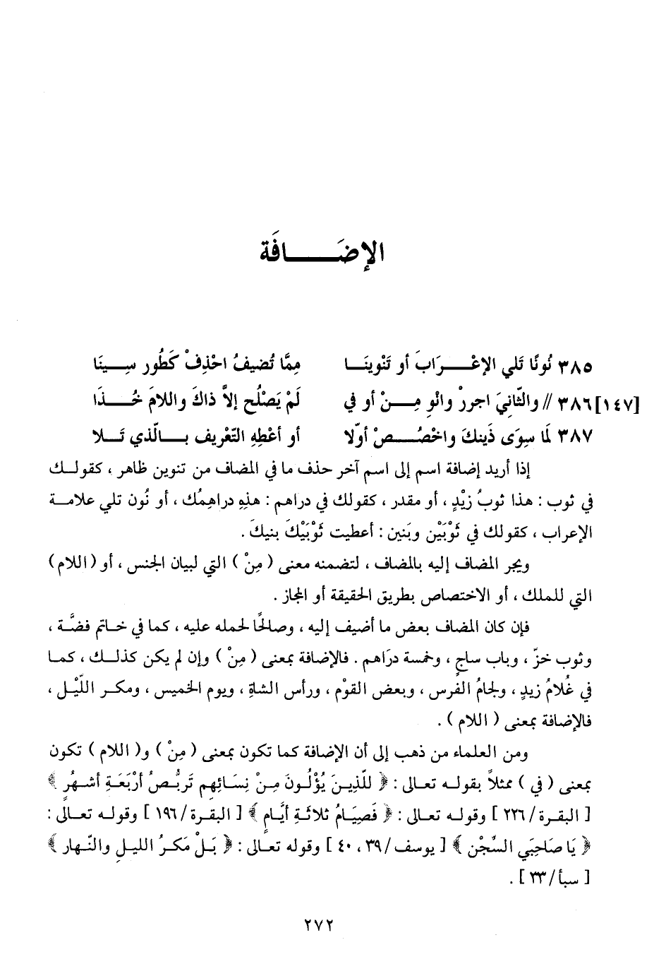 ويجر المضاف إليه بالمضاف، لتضمنه معنى (من) التي لبيان الجنس، أو (اللام) التي للملك، أو الاختصاص بطريق الحقيقة أو المجاز.