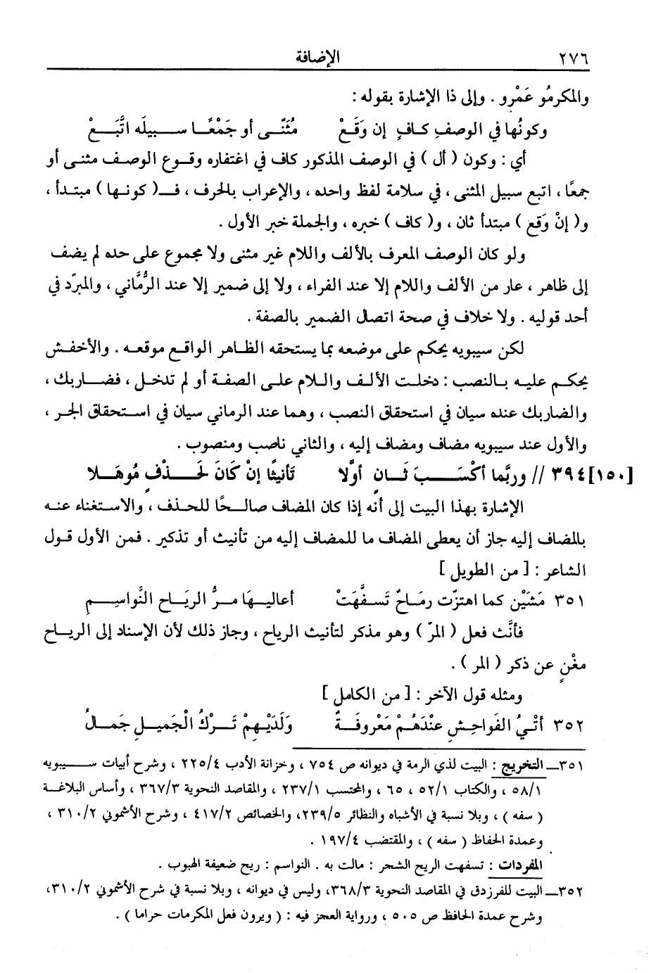 ولو كان الوصف المعرف بالألف واللام غير مثنى ولا مجموع على حده لم يضف إلى ظاهر، عار من الألف واللام إلا عند الفراء، ولا إلى ضمير إلا عند الرماني، والمبرد في أحد قوليه. ولا خلاف في صحة اتصال الضمير بالصفة.