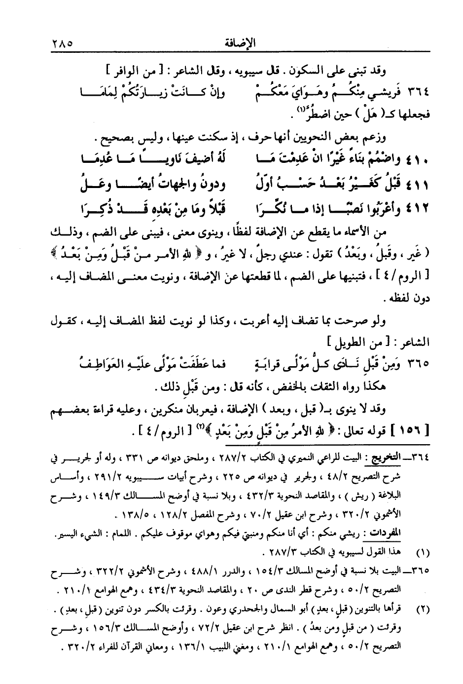 وقد لا ينوى بـ (قبل، وبعد) الإضافة، فيعربان منكرين، وعليه قراءة بعضهم [156] قوله تعالى: (لله الأمر من قبل ومن بعد) [الروم /4].