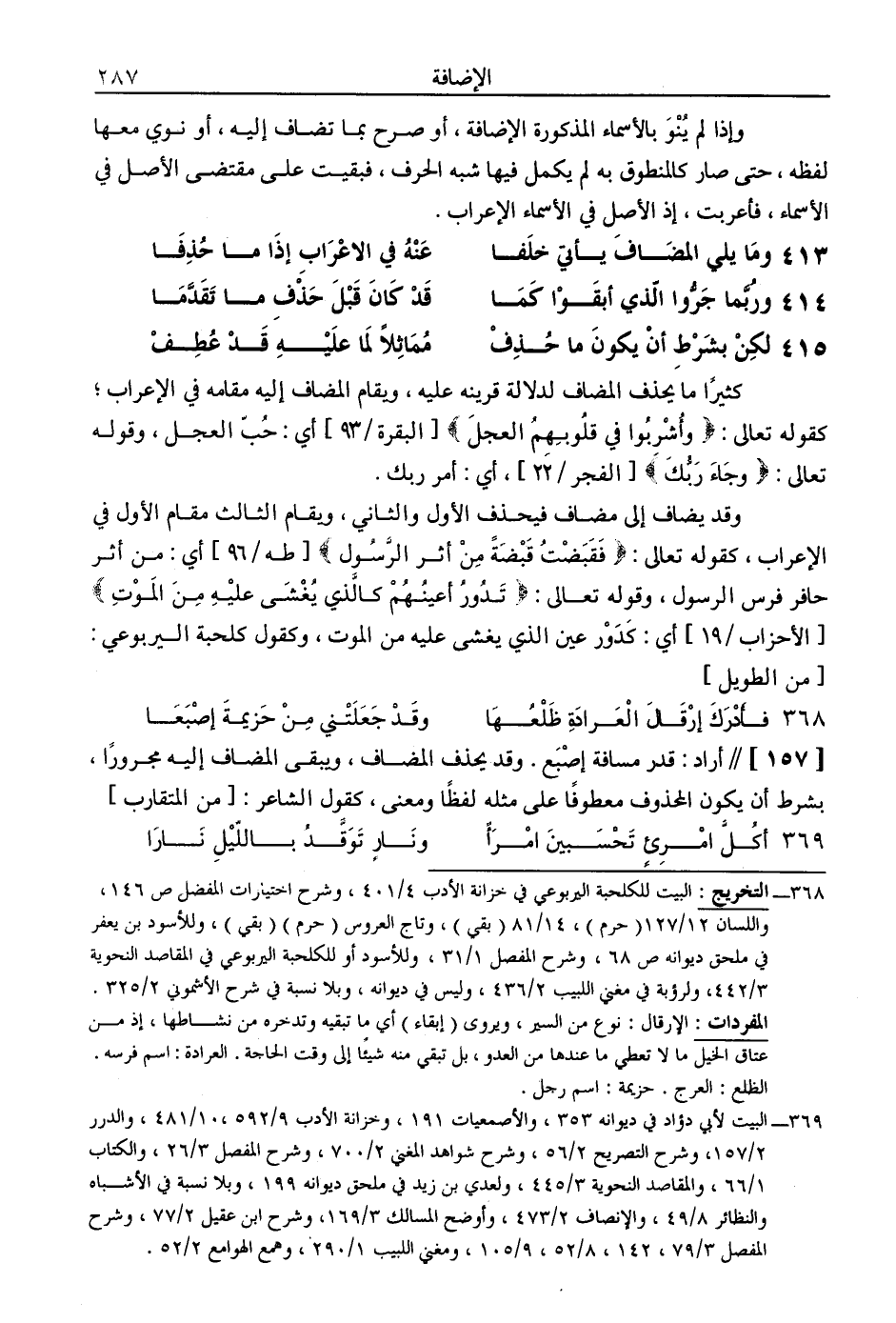 [157] // أراد: قدر مسافة إصبع. وقد يحذف المضاف، ويبقى المضاف إليه مجرورًا، بشرط أن يكون المحذوف معطوفًا على مثله لفظًا ومعنى، كقول الشاعر: [من المتقارب]