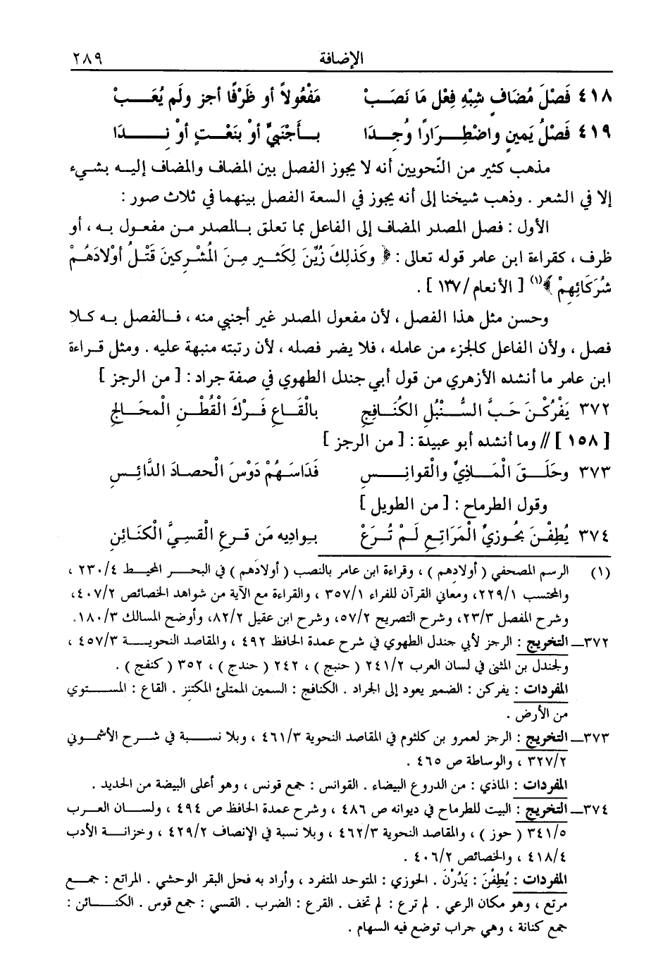 وحسن مثل هذا الفصل، لأن مفعول المصدر غير أجنبي منه، فالفصل به كلا فصل، ولأن الفاعل كالجزء من عامله، فلا يضر فصله، لأن رتبته منبهة عليه. ومثل قراءة ابن عامر ما أنشده الأزهري من قول أبي جندل الطهوي في صفة جراد: [من الرجز]