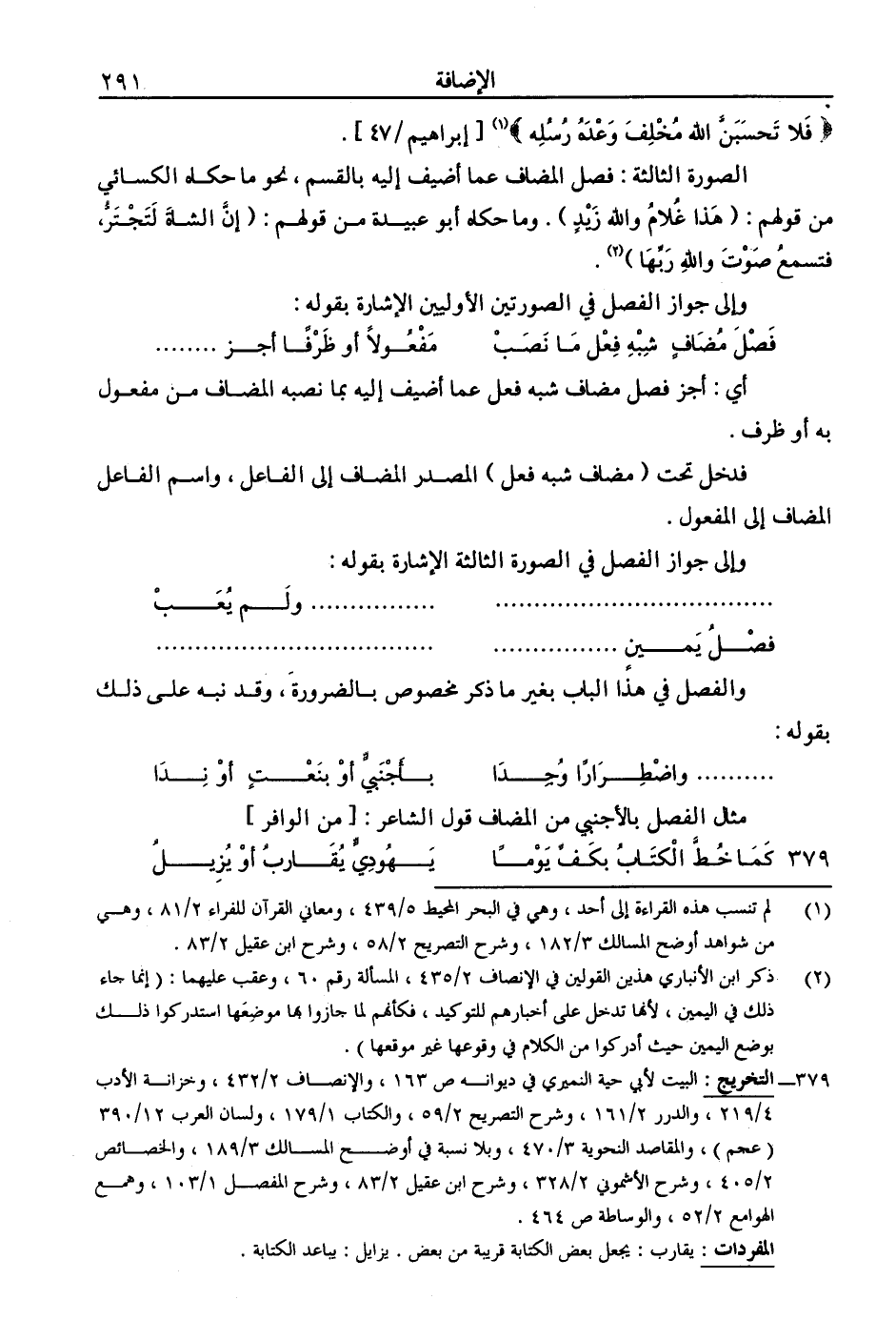 مثال الفصل بالأجنبي من المضاف قول الشاعر: [من الوافر]