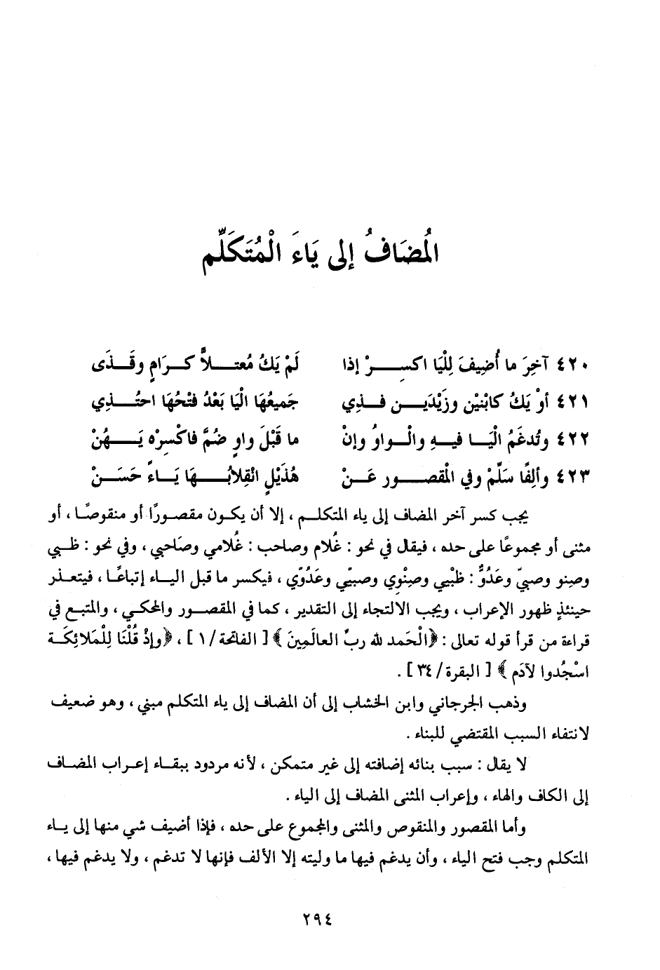 يجب كسر آخر المضاف إلى ياء المتكلم، إلا أن يكون مقصورًا أو منقوصًا، أو مثنى أو مجموعًا على حده، فيقال في نحو: غلام وصاحب: غلامي وصاحبي، وفي نحو: ظبي وصنو وصبي وعدو: ظبيي وصنوي وضببي وعدوي، فيكسر ما قبل الياء إتباعًا، فيتعذر حينئذٍ ظهور الإعراب، ويجب الالتجاء إلى التقدير، كما في المقصور والمحكي، والمتبع في قراءة من قرأ قوله تعالى: (الحمد لله رب العالمين) [الفاتحة /1]، (وإذ قلنا للملائكة اسجدوا لآدم) [البقرة /34].