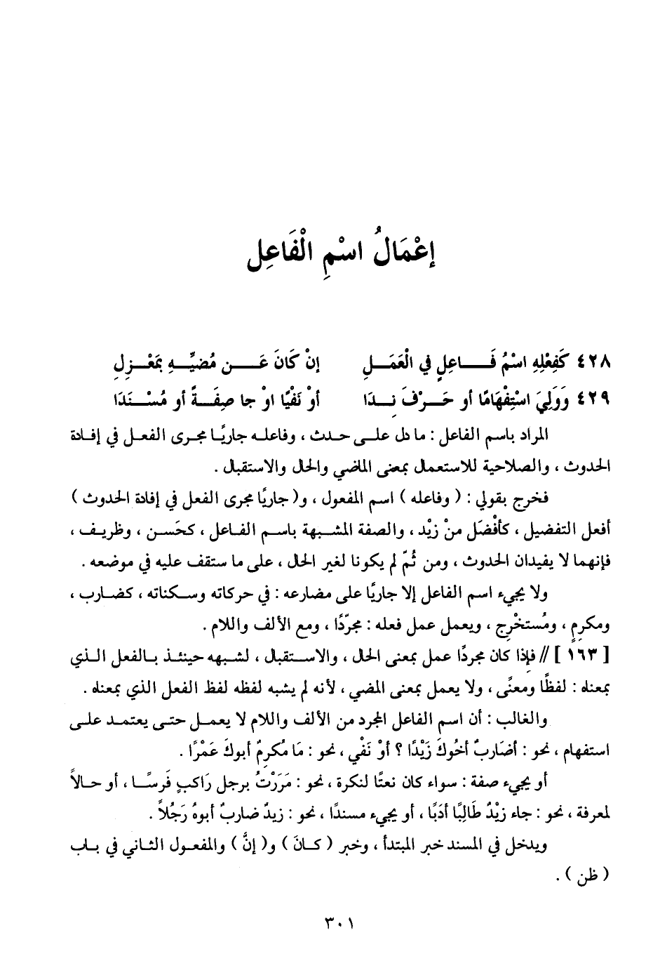 [163] // فإذا كان مجردًا عمل بمعنى الحال، والاستقبال، لشبهه حينئذ بالفعل الذي بمعناه: لفظًا ومعنىً، ولا يعمل بمعنى المضي، لأنه لم يشبه لفظه الفعل الذي بمعناه.