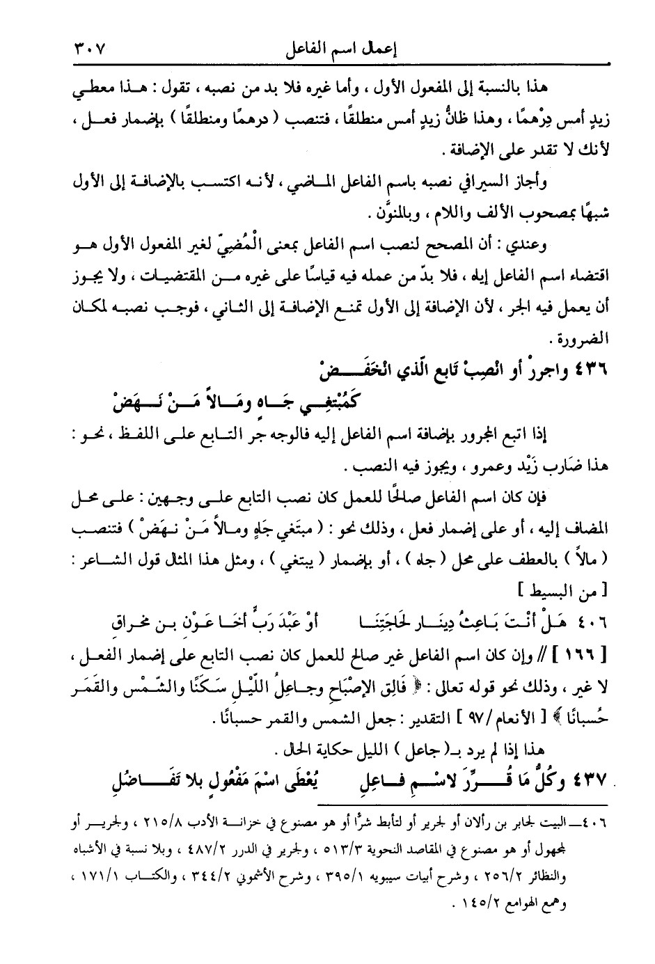 [166] // وإن كان اسم الفاعل غير صالح للعمل كان نصب التابع على إضمار الفعل، لا غير، وذلك نحو قوله تعالى: (فالق الإصباح وجاعل الليل سكنًا والشمس والقمر حسبانًا) [الأنعام /97] التقدير: جعل الشمس والقمر حسبانًا.