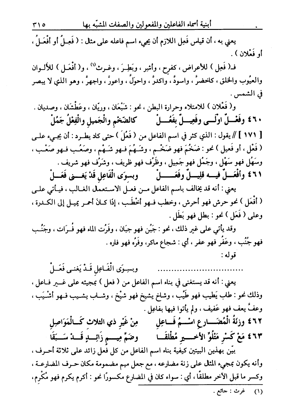 [171] // يقول: الذي كثر في اسم الفاعل من (فعل) حتى كاد يطرد: ان يجيء على (فعل، أو فعيل) نحو: ضخم فهو ضخم، وشهم فهو شهم، وصعب فهو صعب، وسهل فهو سهل، وجمل فهو جميل، وظرف فهو ظريف، وشرف فهو شريف.