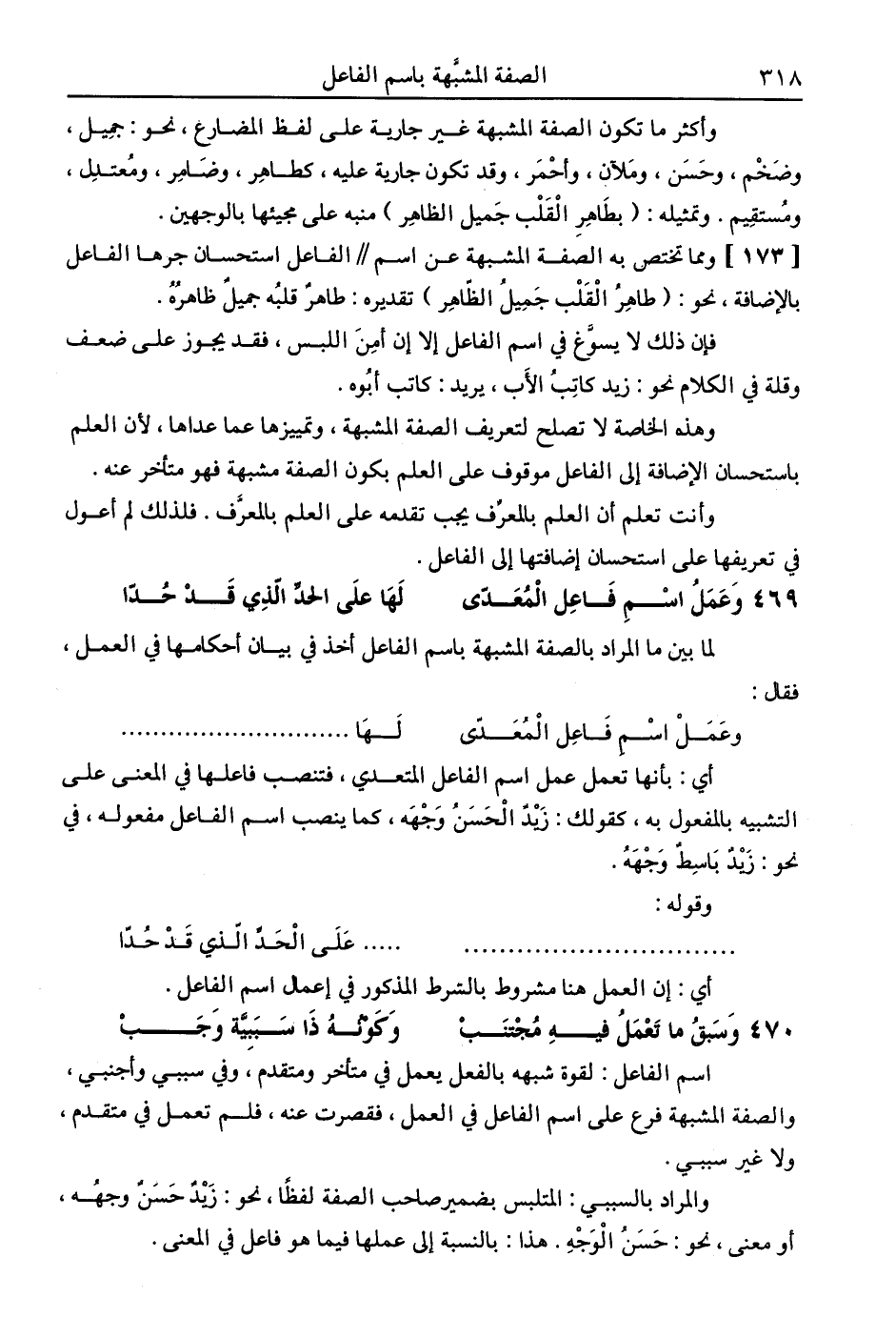 [173] ومما تختص به الصفة المشبهة عن اسم // الفاعل استحسان جرها الفاعل بالإضافة، نحو: (طاهر القلب جميل الظاهر) تقديره: طاهر قلبه جميل ظاهره.