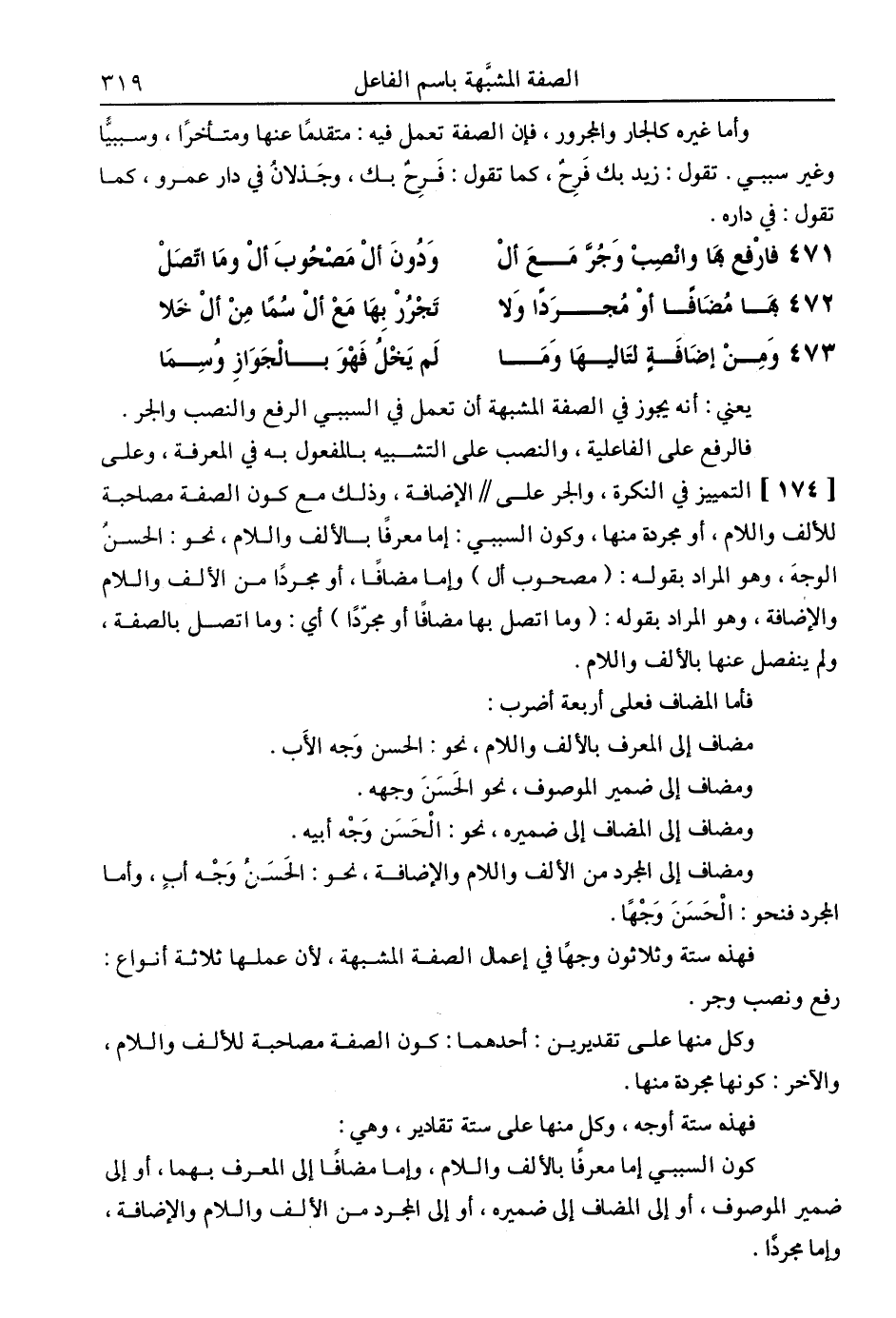 يعني: أنه يجوز في الصفة المشبهة أن تعمل في السببي الرفع والنصب والجر. فالرفع على الفاعلية، والنصب على التشبيه بالمفعول به في المعرفة، وعلى [174] التمييز في النكرة، والجر على // الإضافة، وذلك مع كون الصفة مصاحبة للألف واللام، أو مجردة منها، وكون السببي: إما معرفًا بالألف واللام، نحو: الحسن الوجه، وهو المراد بقوله: (مصحوب أل) وإما مضافًا، أو مجردًا من الألف واللام والإضافة، وهو المراد بقوله: (وما اتصل بها مضافًا أو مجردًا) أي: وما اتصل بالصفة، ولم ينفصل عنها بالألف واللام.