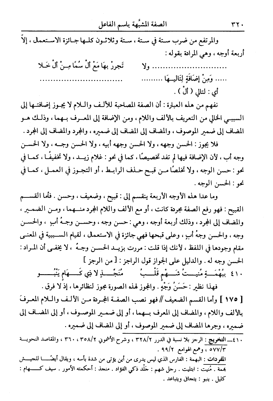 وما عدا هذه الأوجه الأربعة ينقسم إلى: قبيح، وضعيف، وحسن. فأما القسم القبيح: فهو رفع الصفة مجردة كانت، أو مع الألف واللام المجرد منهما، ومن الضمير، والمضاف إلى المجرد، وذلك أربعة أوجه، وهي: حسن وجه، وحسن وجه أبٍ، والحسن وجه، والحسن وجه أبٍ، وعلى قبحها فهي جائزة في الاستعمال، لقيام السببية في المعنى مقام وجودها في اللفظ، لأنك إذا قلت: مررت بزيد الحسن وجه، لا يخفى أن المراد: الحسن وجه له. والدليل على الجواز قول الرجز: [من الرجز]