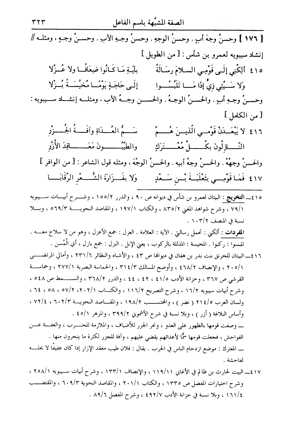 [176] وحسن وجه أبٍ. وحسن الوجه. وحسن وجه الأب. وحسن وجهٍ، ومثله // إنشاد سيبويه لعمرو بن شأس: [من الطويل]