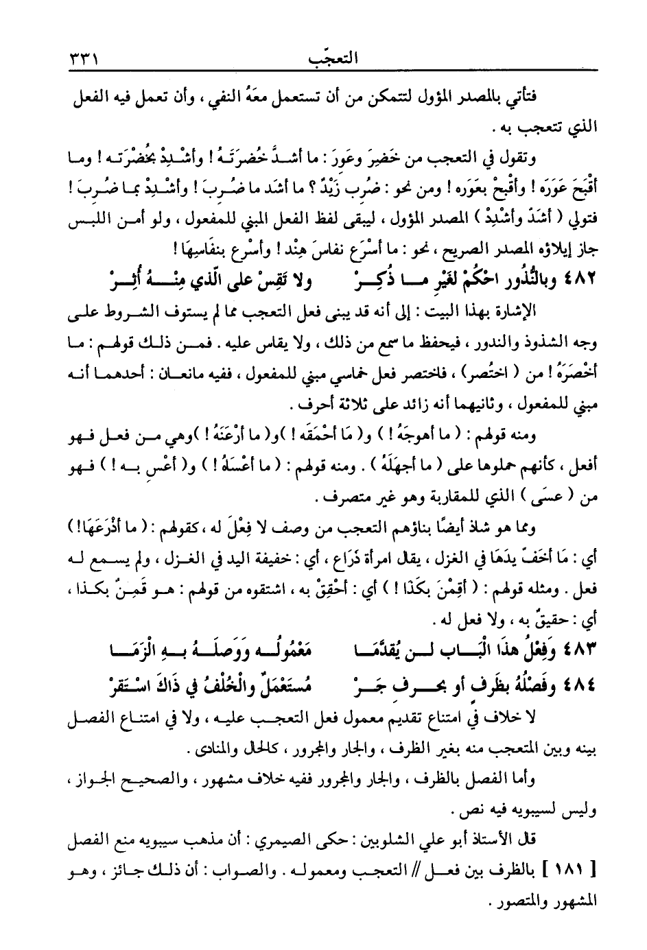 قال الأستاذ أبو علي الشلوبين: حكي الصيمري: أن مذهب سيبويه منع الفصل [181] بالظرف بين فعل // التعجب ومعموله. والصواب: أن ذلك جائز، وهو المشهور والمتصور.