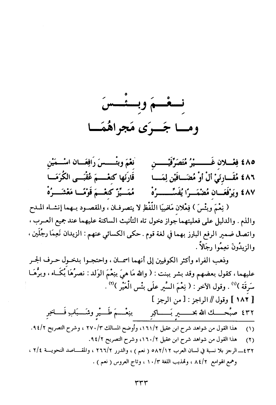 (نعم وبئس) فعلان ماضيا اللفظ لا يتصرفان، والمقصود بهما إنشاء المدح والذم. والدليل على فعليتهما جواز دخول تاء التأنيث الساكنة عليهما عند جميع العرب، واتصال ضمير الرفع البارز بهما في لغة قوم. حكي الكسائي عنهم: الزيدان نعما رجلين، والزيدون نعموا رجالا.
