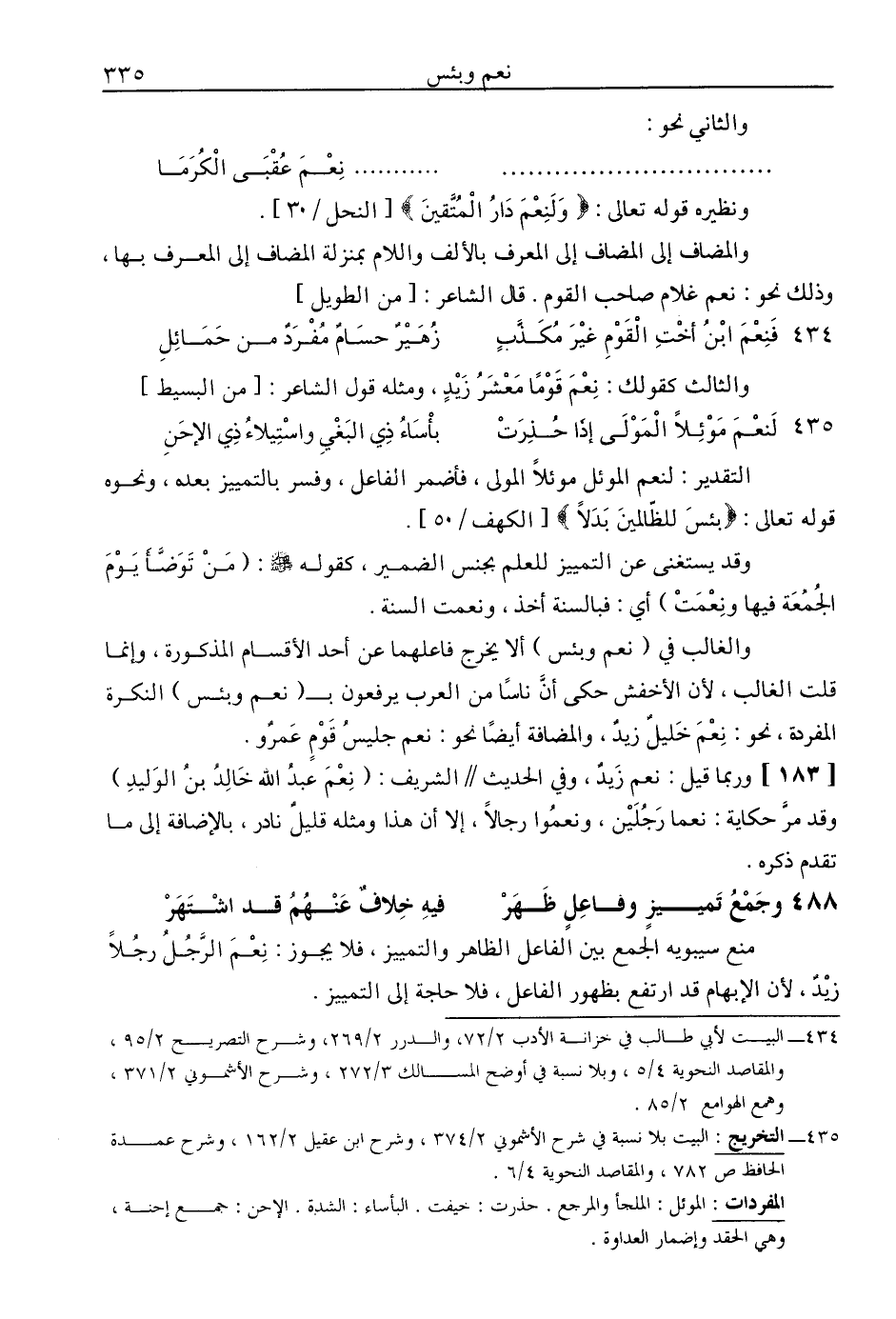 [183] وربما قيل: نعم زيد، وفي الحديث // الشريف: (نعم عبد الله خالد بن الوليد) وقد مر حكاية: نعما رجلين، ونعموا رجالا، إلا أن هذا ومثله قليل نادر، بالإضافة إلى ما تقدم ذكره.