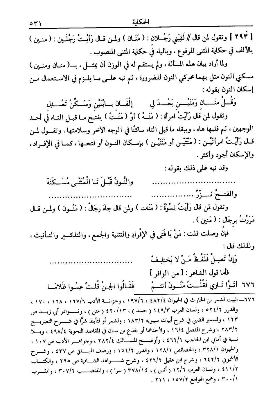 [293] وتقول لمن قال لقيني رجلان: (منان) ولمن قال رأيت رجلين: (منين) بالألف في حكاية المثنى المرفوع، وبالياء في حكاية المثنى المنصوب.