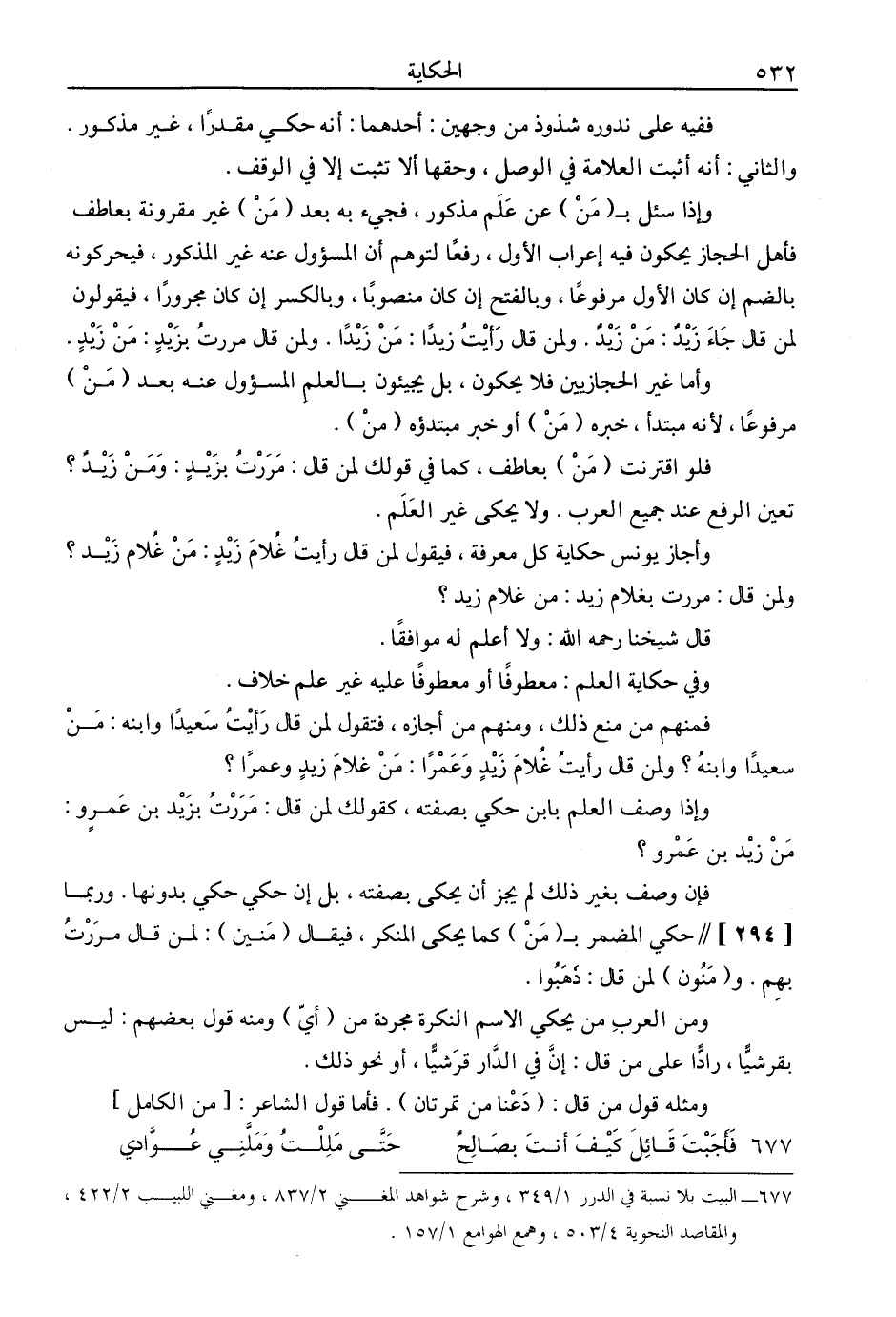 وإذا سئل بـ (من) عن علم مذكور، فجيء به بعد (من) غير مقرونة بعاطف فأهل الحجاز يحكون فيه إعراب الأول، رفعا لتوهم أن المسئول عنه غير المذكور، فيحركونه بالضم إن كان الأول مرفوعا، وبالفتح إن كان منصوبا، وبالكسر إن كان مجرورا، فيقولون لمن قال جاء زيد: من زيد. ولمن قال رأيت زيدا: من زيدا. ولمن قال مررت بزيد: من زيد.