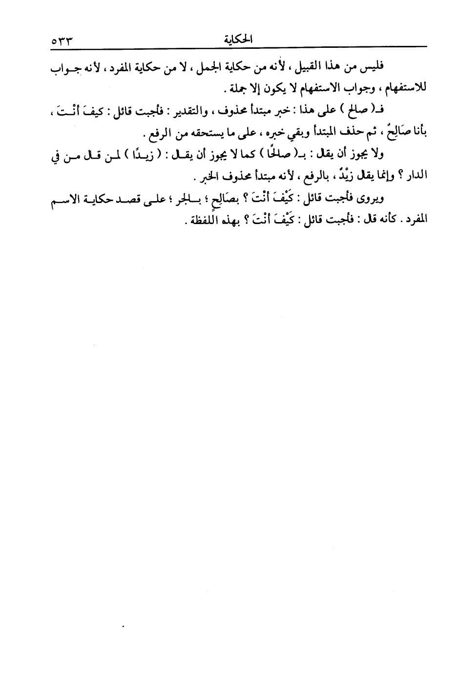 ويروى فأجبت قائل: كيف أنت؟ بصالح؛ بالجر؛ على قصد حكاية الاسم المفرد. كأنه قال: فأجبت قائل: كيف أنت؟ بهذه اللفظة.