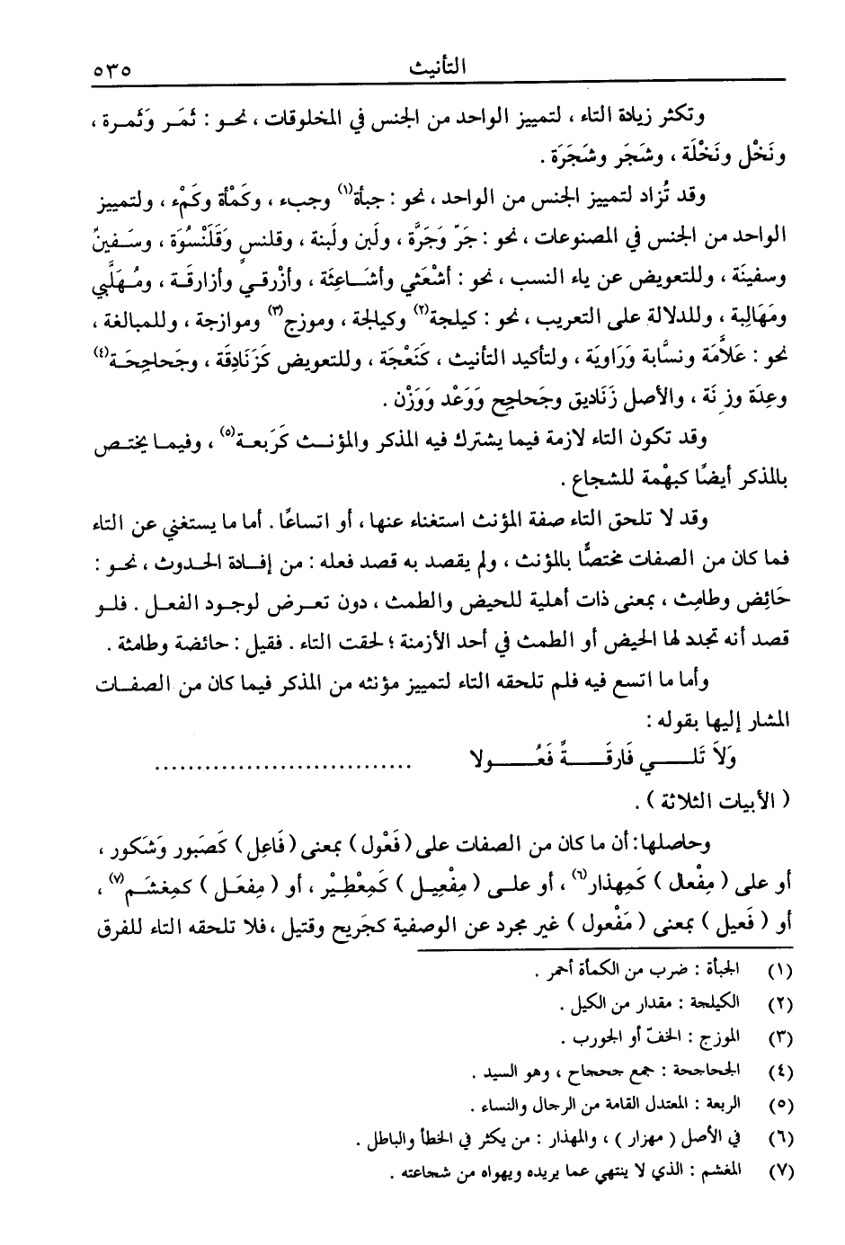 وقد تزاد لتمييز الجنس من الواحد، نحو: جبأة وجبء، وكمأة وكمء، ولتمييز الواحد من الجنس في المصنوعات، نحو: جر وجرة، ولبن ولبنة، وقلنس وقلنسوة، وسفين وسفينة، وللتعويض عن ياء النسب، نحو: أشعثي وأشاعثة، وأزرقي وأزارقة، ومهلبي ومهالبة، وللدلالة علي التعريب، نحو: كيلجة وكيالجة، وموزج وموازجة، وللمبالغة نحو: علامة ونسابة وراوية، ولتأكيد التأنيث، كنعجة، وللتعويض كزنادقة، وجحاجحة وعدة وزنة، والأصل زناديق وجحاجح ووعد ووزن.