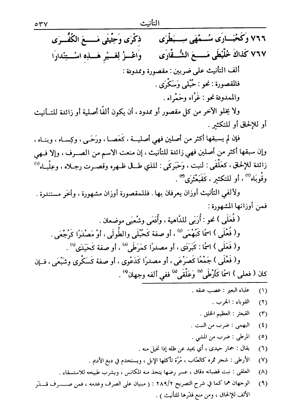 ولألفي التأنيث أوزان يعرفان بها. فللمقصورة أوزان مشهورة، وأخر مستندرة. فمن أوزانها المشهورة: