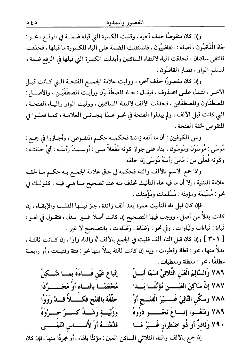 وإن كان مقصورًا حذفت آخره، ووليت علامة الجمع الفتحة التي كانت قبل الآخر، لتدل على المحذوف، فيقال: جاء المصطفون ورأيت المصطفين، والأصل المصطفاون والمصطفاين، فحذفت الألف لالتقاء الساكنين، ووليت الواو والياء الفتحة، التي كانت قبل الألف، ولم يبدلوا الفتحة في نحو هذا بمجانس العلامة، كما فعلوا في المنقوص لخفة الفتحة.