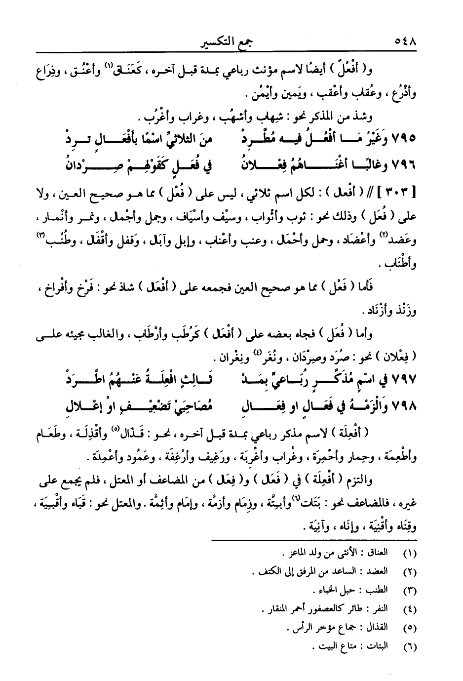 و (أفعل) أيضًا لاسم مؤنث رباعي بمدة قبل آخره، كعناق وأعنق، وذراع وأذرع، وعقاب وأعقب، ويمين وأيمن.