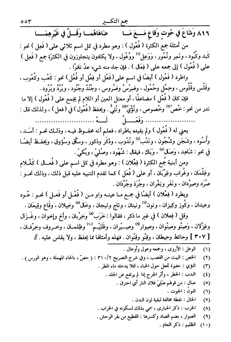 واطرد (فعول) أيضًا في اسم على (فعل أو فعل أو فعل) نحو: كعب وكعوب، وقلس وقلوس، وحمل وحمول، وضرس وضروس، وجند وجنود، وبرد وبرود.
