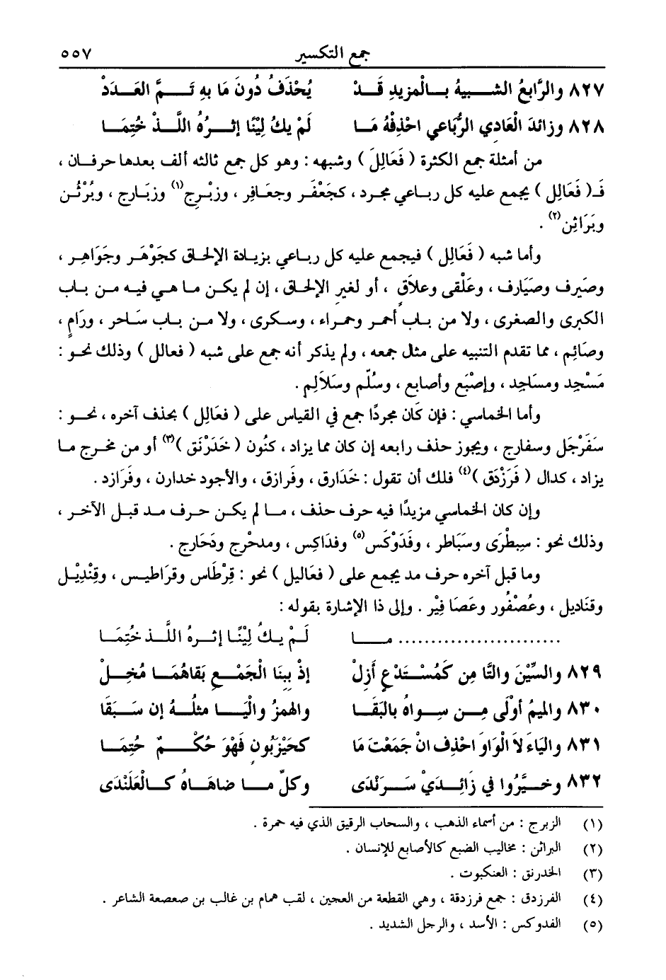 وأما الخماسي: فإن كان مجردًا جمع في القياس على (فعالل) بحذف آخره، نحو: سفرجل وسفارج، ويجوز حذف رابعه إن كان مما يزاد، كنون (خدرنق) أو من مخرج ما يزاد، كدال (فرزدق) فلك أن تقول: خدارق، وفرازق، والأجود خدارن، وفرازد.