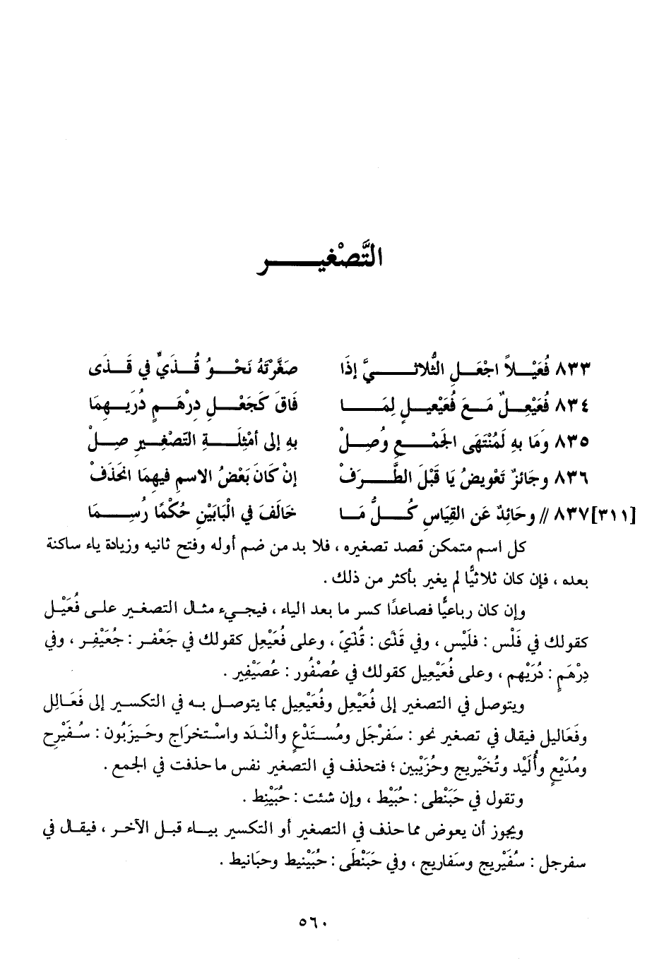 كل اسم متمكن قصد تصغيره، فلا بد من ضم أوله وفتح ثانيه وزيادة ياء ساكنة بعده، فإن كان ثلاثيًّا لم يغير بأكثر من ذلك.