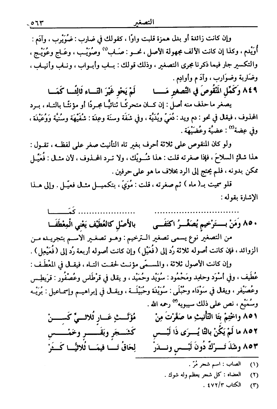 ولو كان المنقوص على ثلاثة أحرف بغير تاء التأنيث صغر على لفظه، تقول: هذا شاك السلاح، فإذا صغرته قلت: هذا شويك، ولا ترد المحذوف، لأن مثال: فعيل ممكن بدونه، فلم يحتج إلى الرد بخلاف ما هو على حرفين.