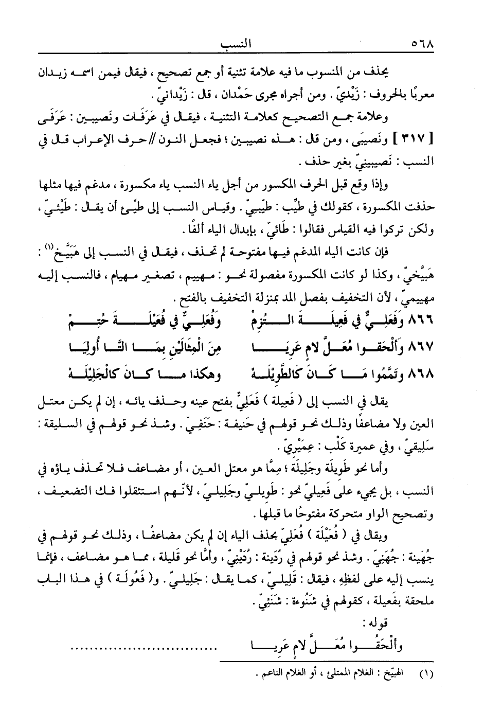 وأما نحو طويلة وجليلة؛ مما هو معتل العين، أو مضاعف فلا تحذف ياؤه في النسب، بل يجيئ على فعيلي نحو: طويلي وجليلي، لأنهم استثقلوا فك التضعيف، وتصحيح الواو متحركة مفتوحا ما قبلها.