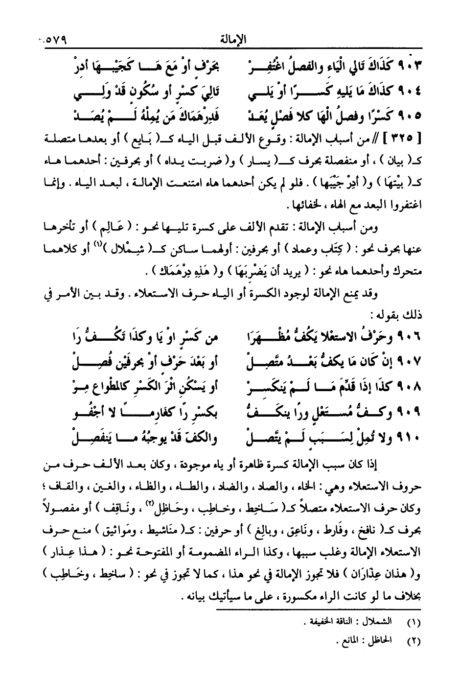 [325] // من أسباب الإمالة: وقوع الألف قبل الياء كـ (بايع) أو بعدها متصلة كـ (بيان)، أو منفصلة بحرف كـ (يسار) و (ضربت يداه) أو بحرفين: أحدهما هاء كـ (بيتها) و (أدر جيبها). فلو لم يكن أحدهما هاء امتنعت الإمالة، لبعد الياء. وإنما اغتفروا البعد مع الهاء، لخفائها.