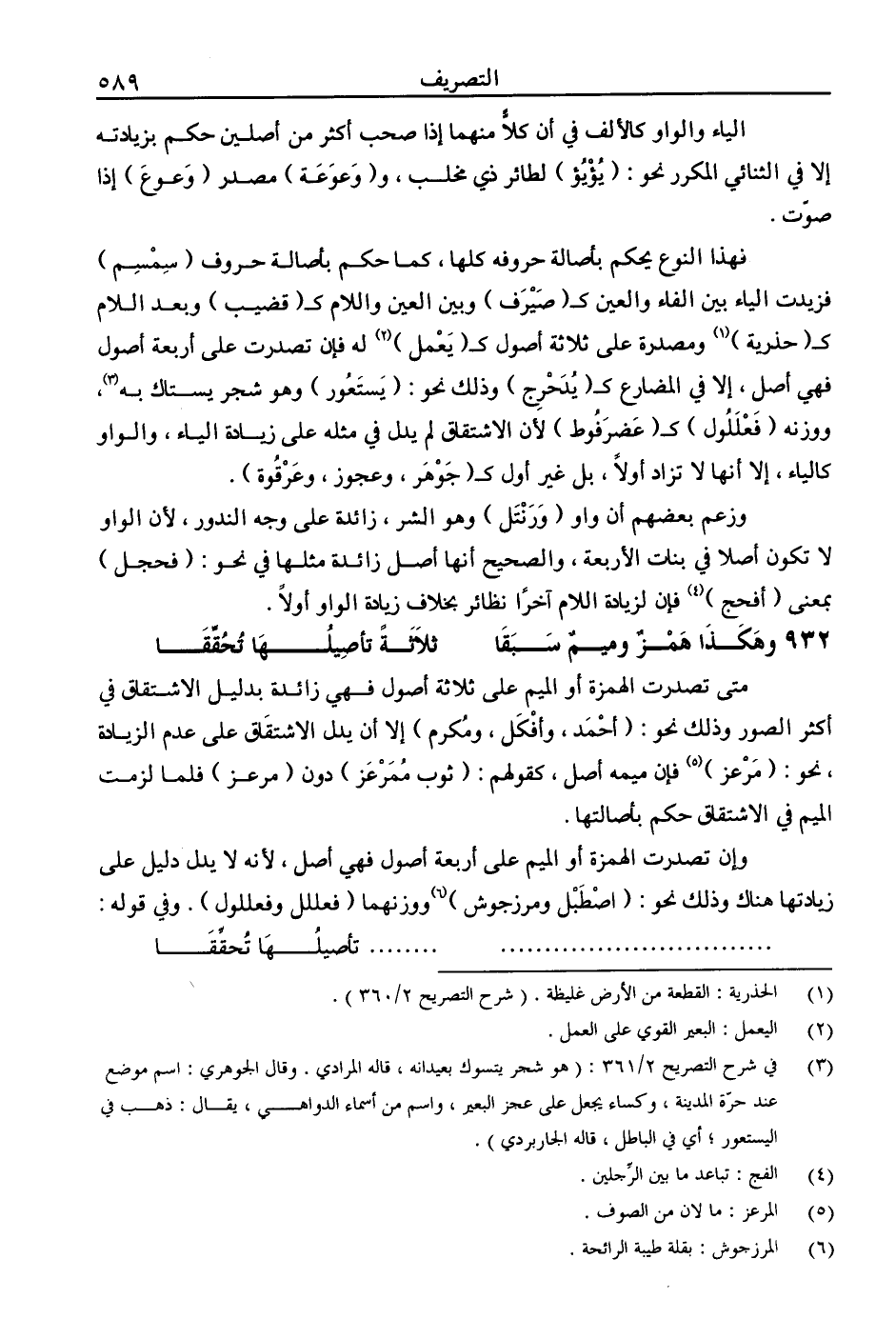 فهذا النوع يحكم بأصالة حروفه كلها، كما حكم بأصالة حروف (سمسم) فزيدت الياء بين الفاء والعين ك (صيرف) وبين العين واللام ك (قضيب) وبعد اللام ك (حذرية) ومصدرة على ثلاثة أصول ك (يعمل) له فإن تصدرت على أربعة أصول فهي أصل، إلا في المصارع ك (يدحرج) وذلك نحو: (يستعور) وهو شجر يستاك به، ووزنه (فعللول) ك (عضرفوط) لأن الاشتياق لم يدل في مثله على زيادة الياء، والواو كالياء، إلا أ، ها لا تزاد أولا، بل غير أول ك (جوهر، وعجوز، وعرقوة).