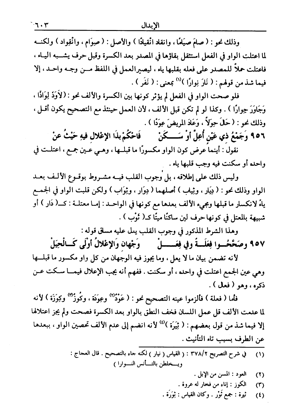 وذلك نحو: (صام صيامًا، وانقاد انقيادًا) والأصل: (صوام، وانقواد) ولكنه لما اعتلت الواو في الفعل استثقل بقاؤها في المصدر بعد الكسرة وقبل حرف يشبه الياء، فاعتلت حملًا للمصدر على فعله بقلبها ياء، ليصير العمل في اللفظ من وجه واحد، إلا فيما شذ من قولهم: (نار نوارًا) بمعنى: (نفر).