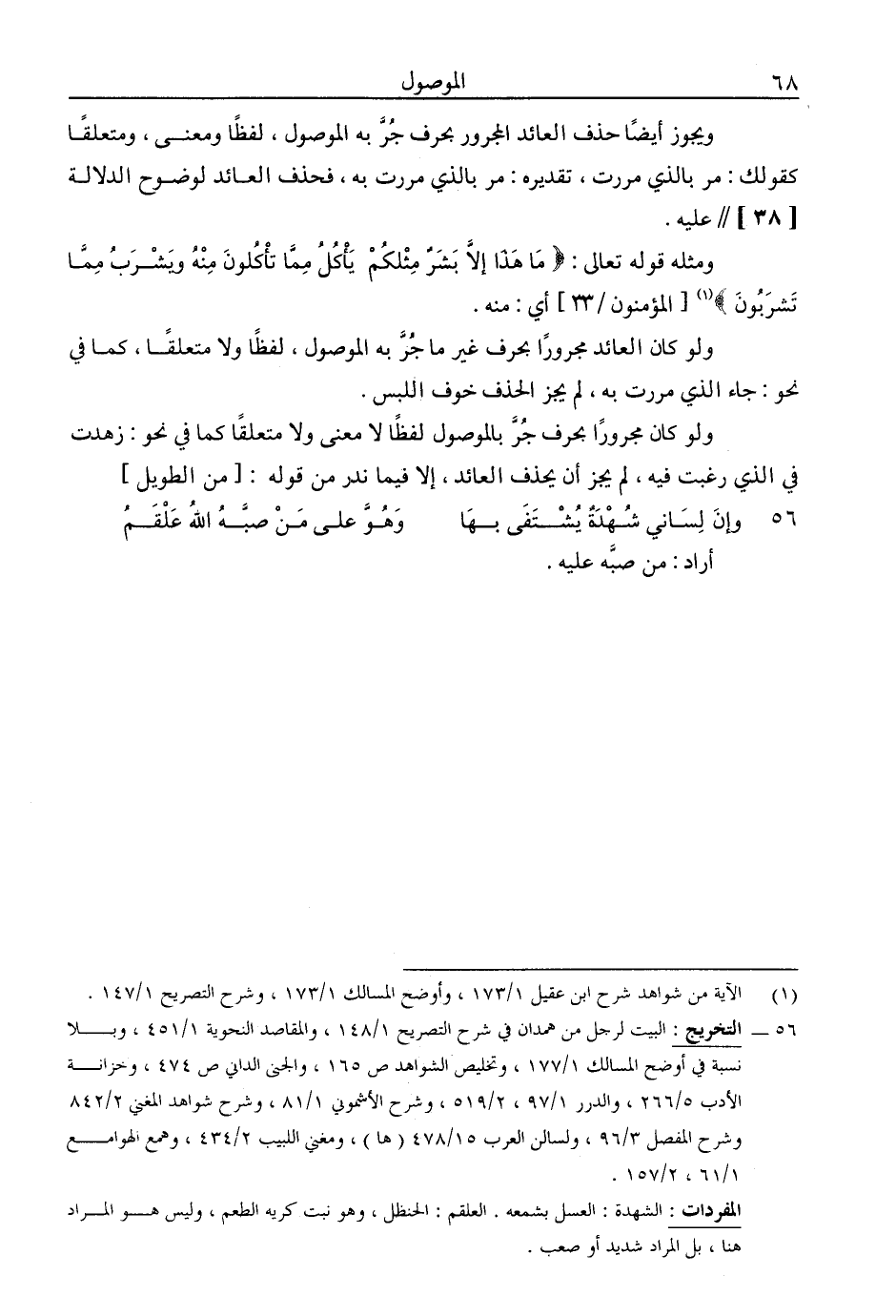 ويجوز أيضًا حذف العائد المجرور بحرف جر به الموصول، لفظًا ومعنى، ومتعلقًا كقولك: مر بالذي مررت، تقديره: مر بالذي مررت به، فحذف العائد لوضوح الدلالة [38] // عليه.