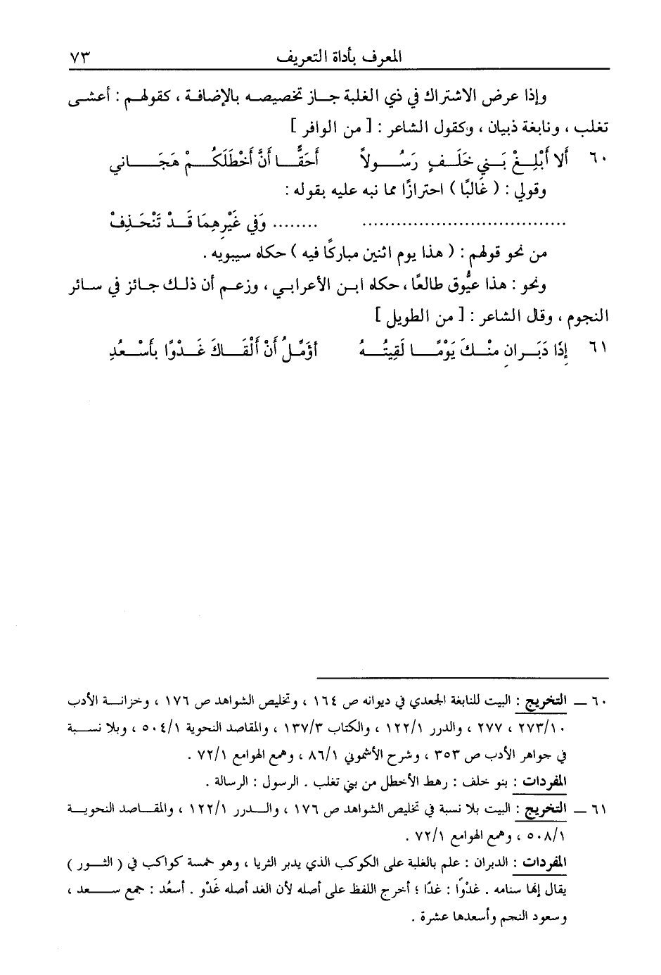 وإذا عرض الاشتراك في ذي الغلبة جاز تخصيصه بالإضافة، كقولهم: أعشى تغلب، ونابغة ذبيان، وكقول الشاعر: [من الوافر]