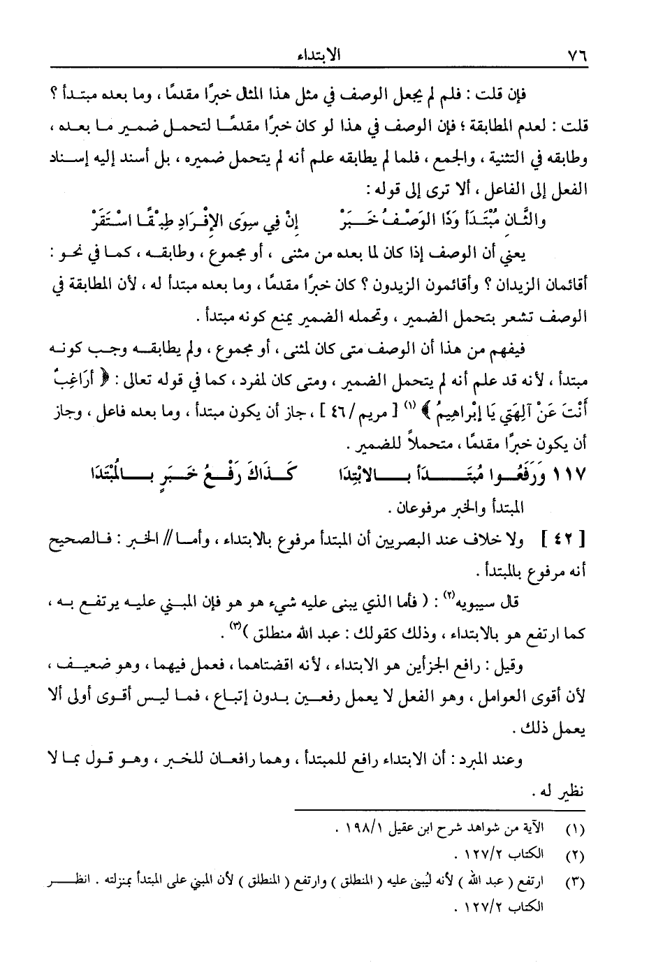 [42] ولا خلاف عند البصريين أن المبتدأ مرفوع بالابتداء، وأما // الخبر: فالصحيح أنه مرفوع بالمبتدأ.