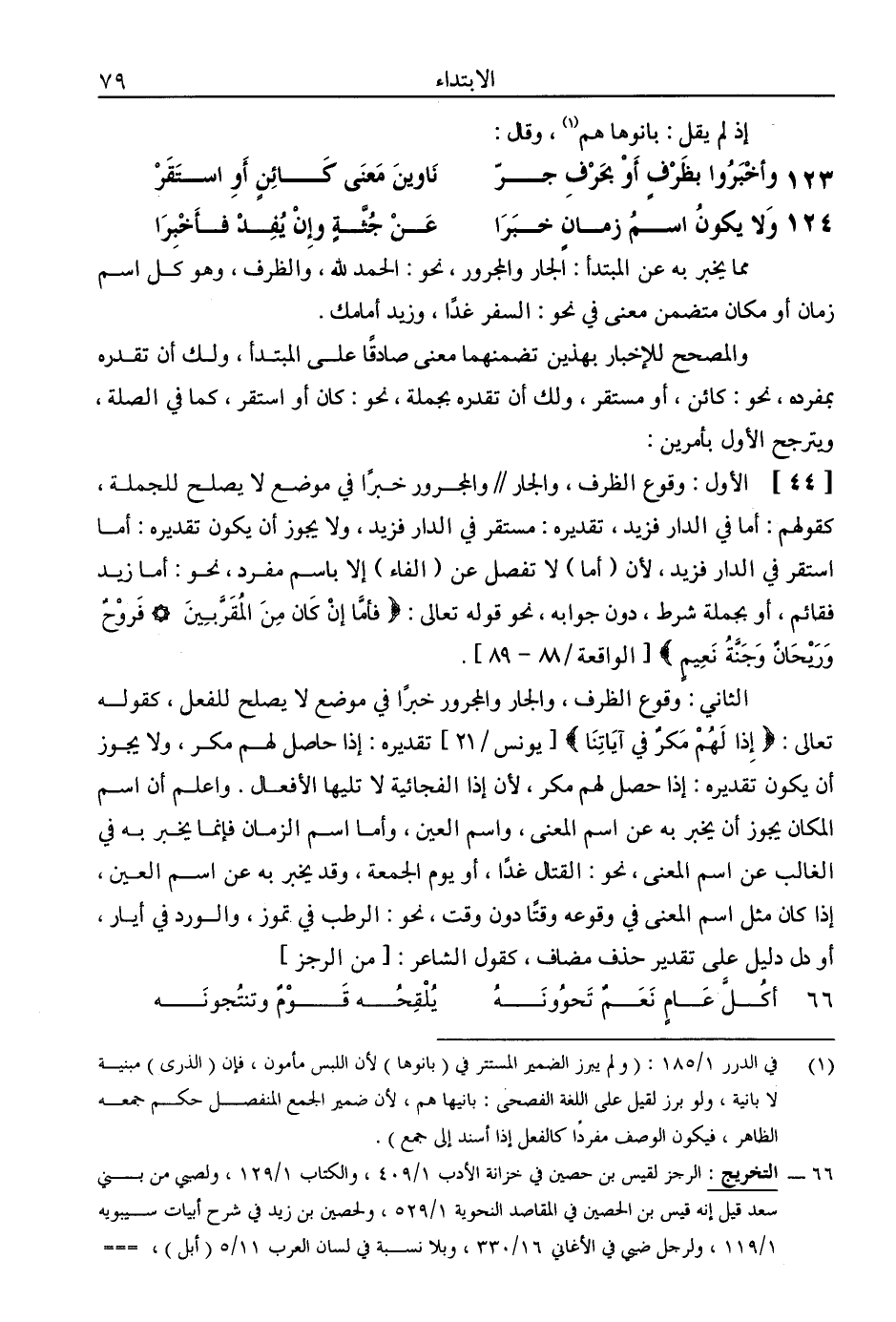 الثاني: وقوع الظرف، والجار والمجرور خبرًا في موضع لا يصلح للفعل، كقوله تعالى: (إذا لهم مكر في آياتنا) [يونس / 21] تقديره: إذا حاصل لهم مكر، ولا يجوز أن يكون تقديره: إذا حصل لهم مكر، لأن إذا الفجائية لا تليها الأفعال. واعلم أن اسم المكان يجوز أن يخبر به عن اسم المعنى، واسم العين، وأما اسم الزمان فإنما يخبر به في الغالب عن اسم المعنى، نحو: القتال غدًا، أو يوم الجمعة، وقد يخبر به عن اسم العين، إذا كان مثل اسم المعنى في وقوعه وقتًا دون وقت، نحو: الرطب في تموز، والورد في أيار، أو دل دليل على تقدير حذف مضاف، كقول الشاعر: [من الرجز]