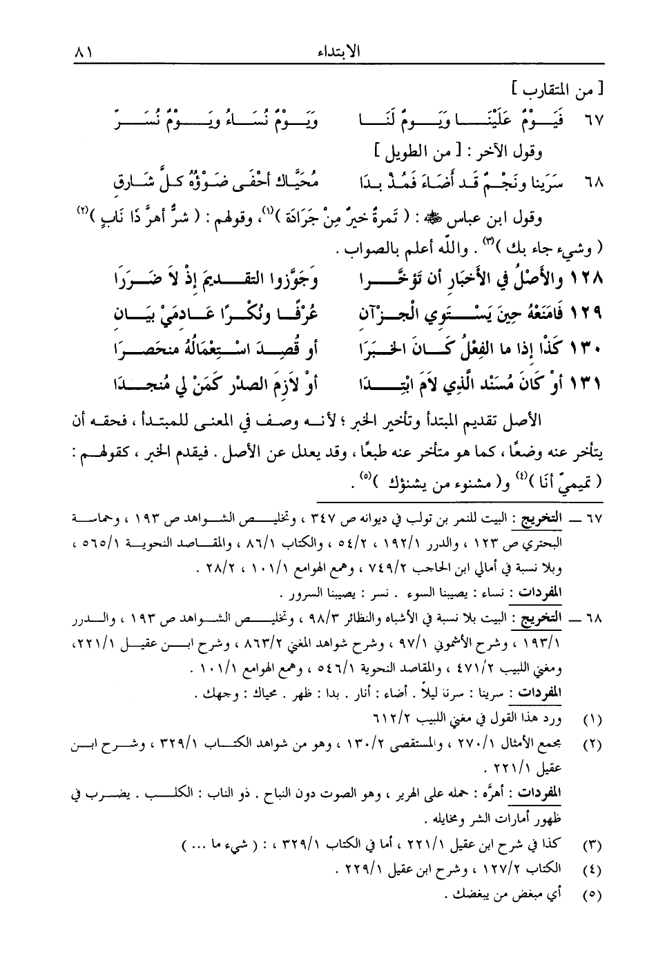 الأصل تقديم المبتدأ وتأخير الخبر؛ لأنه وصف في المعنى للمبتدأ، فحقه أن يتأخر عنه وضعًا، كما هو متأخر عنه طبعًا، وقد يعدل عن الأصل. فيقدم الخبر، كقولهم: (تميمي أنا) و (مشنوء من يشنؤك).