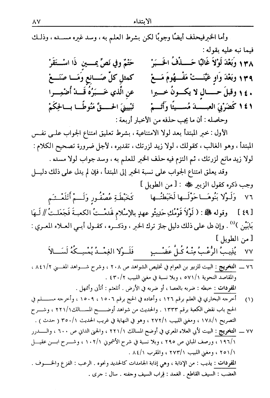 [49] وقوله - صلى الله عليه وسلم -: (لولا قومك حديثو عهدٍ بالإسلام لهدمت الكعبة فجعلت // لها بابين). وإن دل على ذلك دليل جاز ترك الخبر، وذكره، كقول أبي العلاء المعري: [من الطويل]