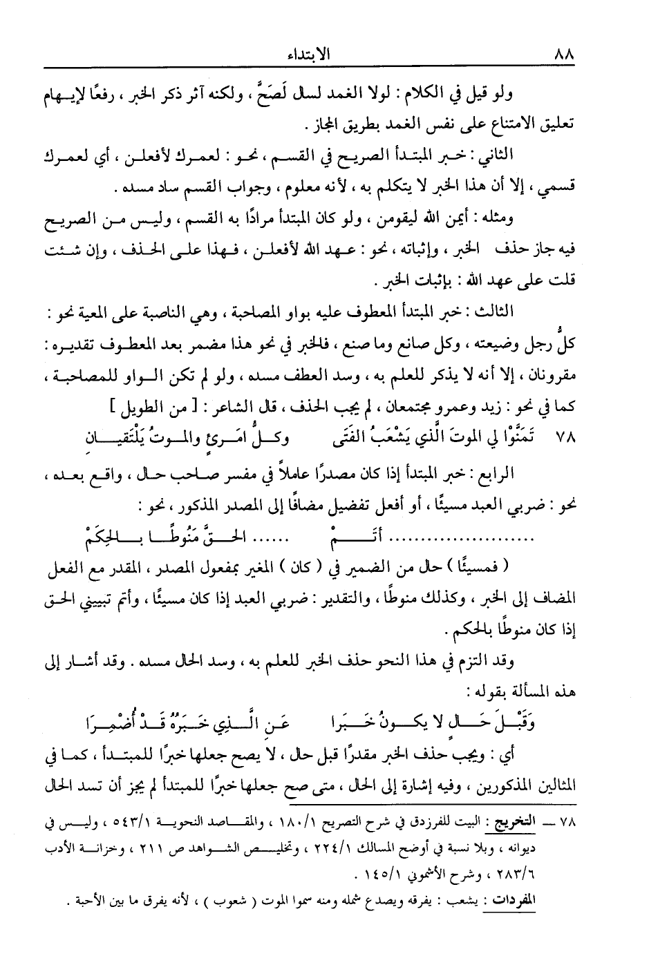 ومثله: أيمن الله ليقومن، ولو كان المبتدأ مرادًا به القسم، وليس من الصريح فيه جاز حذف الخبر، وإثباته، نحو: عهد الله لأفعلن، فهذا على الحذف، وإن شئت قلت على عهد الله: بإثبات الخبر.