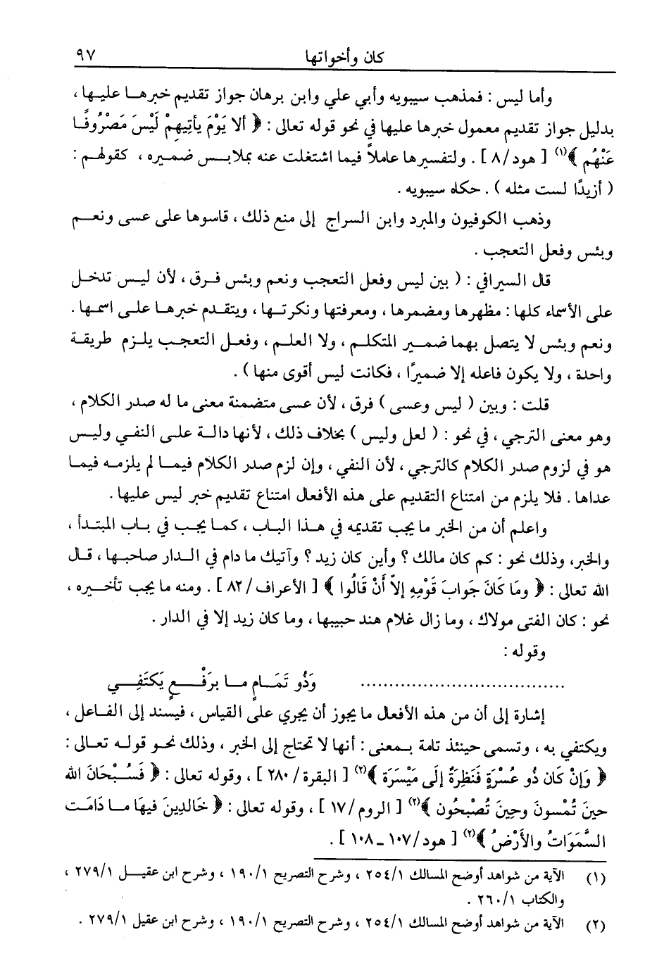 إشارة إلى أن من هذه الأفعال ما يجوز أن يجري على القياس، فيسند إلى الفاعل، ويكتفي به، وتسمى حينئذ تامة بمعنى: أنها لا تحتاج إلى الخبر، وذلك نحو قوله تعالى: (وإن كان ذو عسرةٍ فنظرة إلى ميسرة) [البقرة /280]، وقوله تعالى: (فسبحان الله حين تمسون وحين تصبحون) [الروم /17]، وقوله تعالى: (خالدين فيها ما دامت السموات والأرض) [هود / 107 - 108].