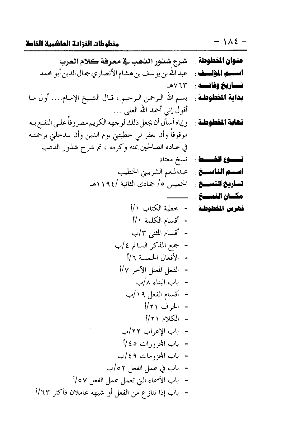 في عباده الصالحين. ممنه وكرمه، تم شرح شذور الذهب