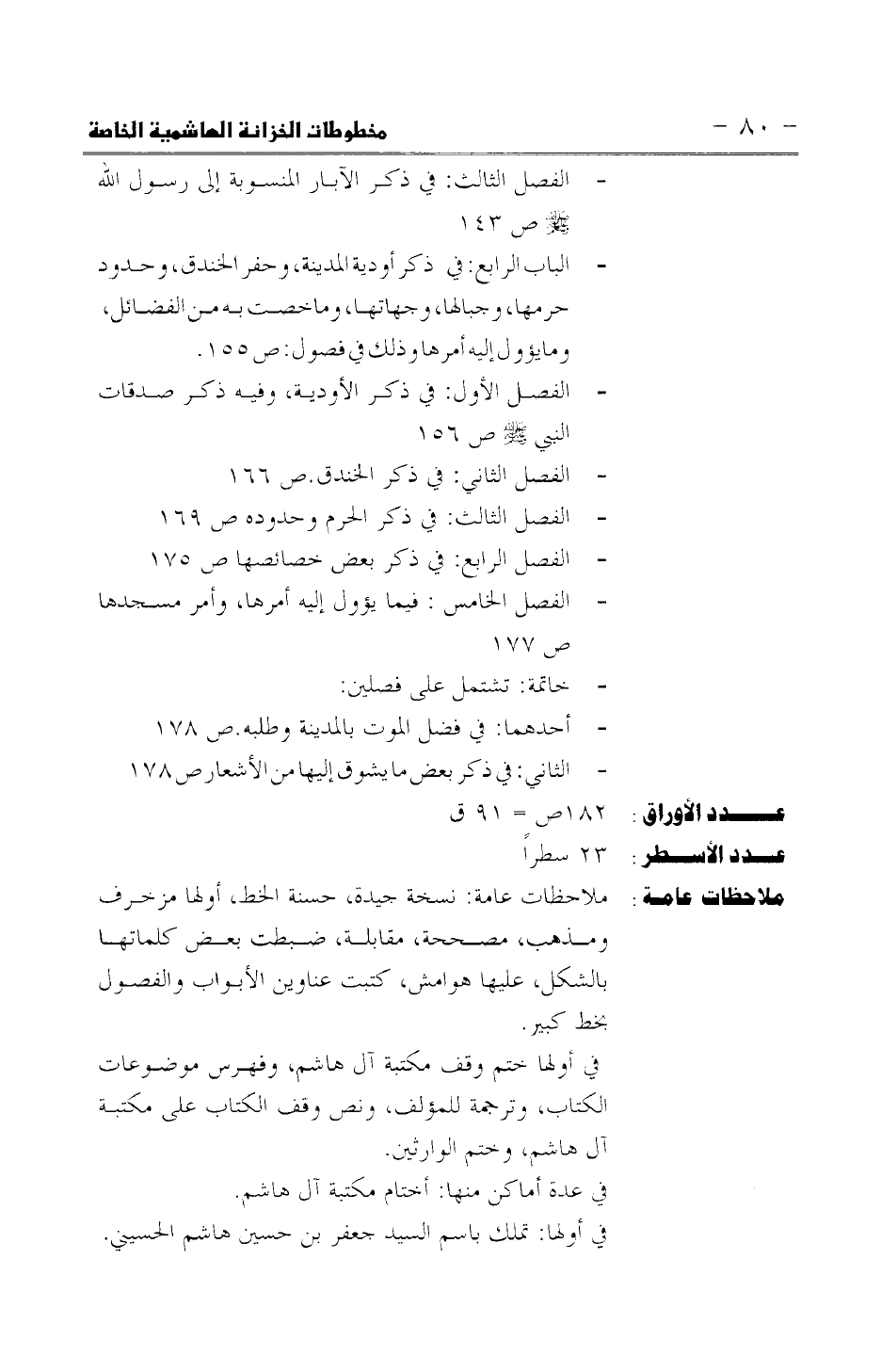 في أولها ختم وقف مكتبة آل هاشم، وفهرس موضوعات